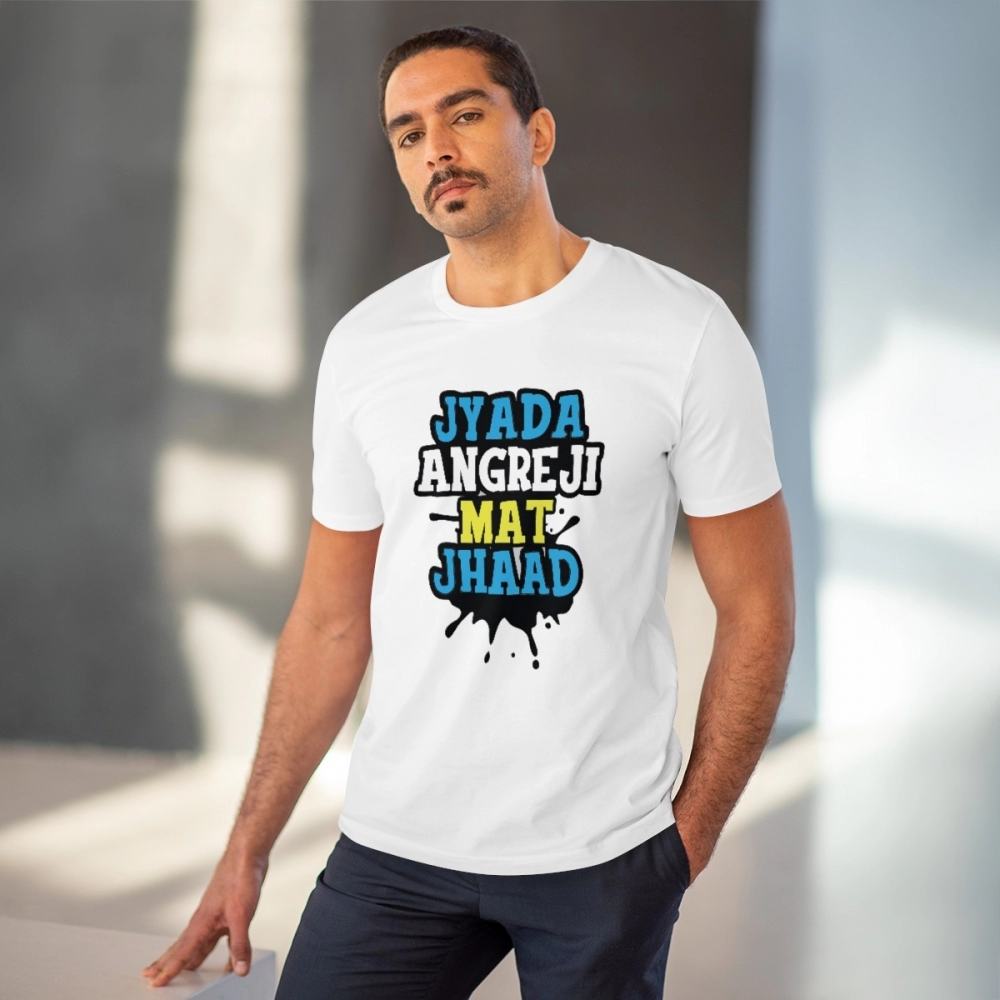 Men’s PC Cotton Jyada Angreji Mat Jhaad Printed T Shirt (Color: White, Thread Count: 180GSM)