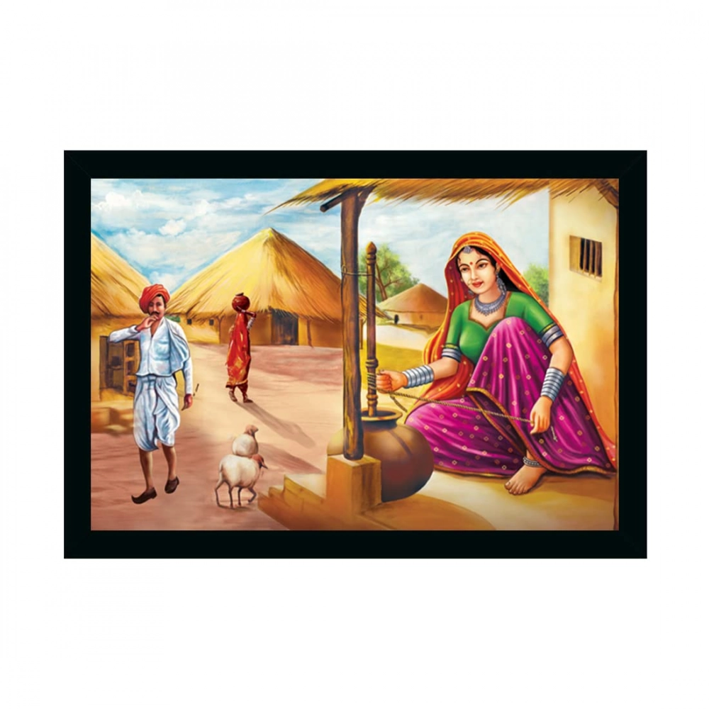 Rajasthani Village Modern Art Painting with Synthetic Photo Frame